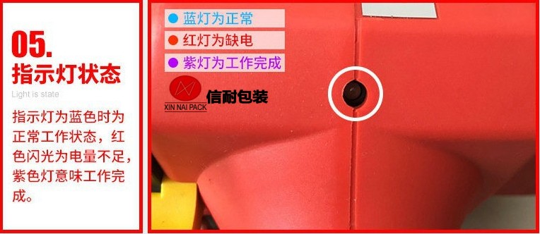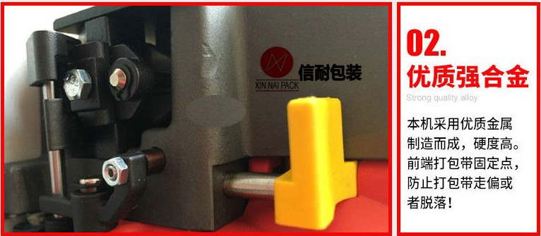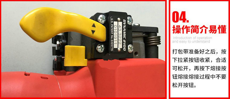 操作方法: 將塑鋼帶或塑料打包帶,從上往下纏繞捆包物體一圈后,將打包帶接頭處放入機(jī)器工作槽內(nèi),由電機(jī)帶動(dòng)束緊輪,將打包帶束緊,通過(guò)摩擦作扣的方式將帶粘接,最后自動(dòng)進(jìn)行切帶。