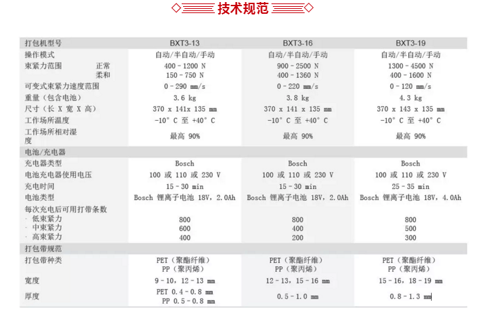 BXT3智能電動(dòng)打捆工具適用于PP/PET等塑料打包帶,并廣泛應(yīng)用于各種輕型、通用和重型打捆場合需求。