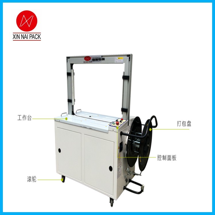 XN-MH101A自動捆包機(高臺標準型)可以自動打包,但臺面無動力,需要人工推一下,包裝物品才能通過打包機。該打包機的原理是使用,PP帶捆緊產品或包裝件,然后收緊并將兩端通過熱效應熔融或使用包扣等材料連接的機器。捆扎機的功用是使塑料PP帶能緊貼于被捆扎包件表面,保證包件在運輸、貯存中不因捆扎不牢而散落。捆扎機價格:全自動捆扎機價格或全自動捆扎機報價是半自動設備的兩倍多。