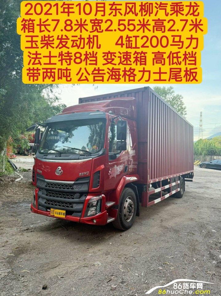 深圳牌。東風柳汽乘龍。2021年10月上牌,箱長7.8米寬2.55米高2.7米,玉柴發動機,4缸200馬力,法士特8檔變速箱高低檔,帶兩噸公告海格力士尾板,保險 年審同步到10月。本車可過戶,可按揭。